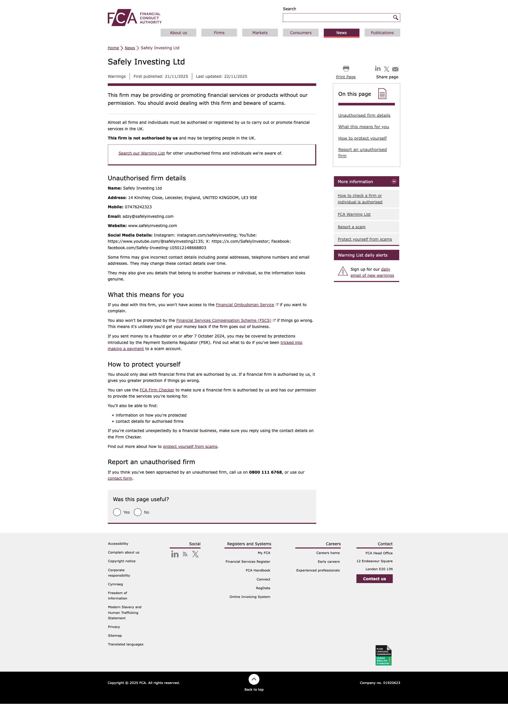 UnauthorizedFCA 2025-11-21 Illegal Trading Warning Latest: Safely Investing Ltd Illegal Business Exposed!