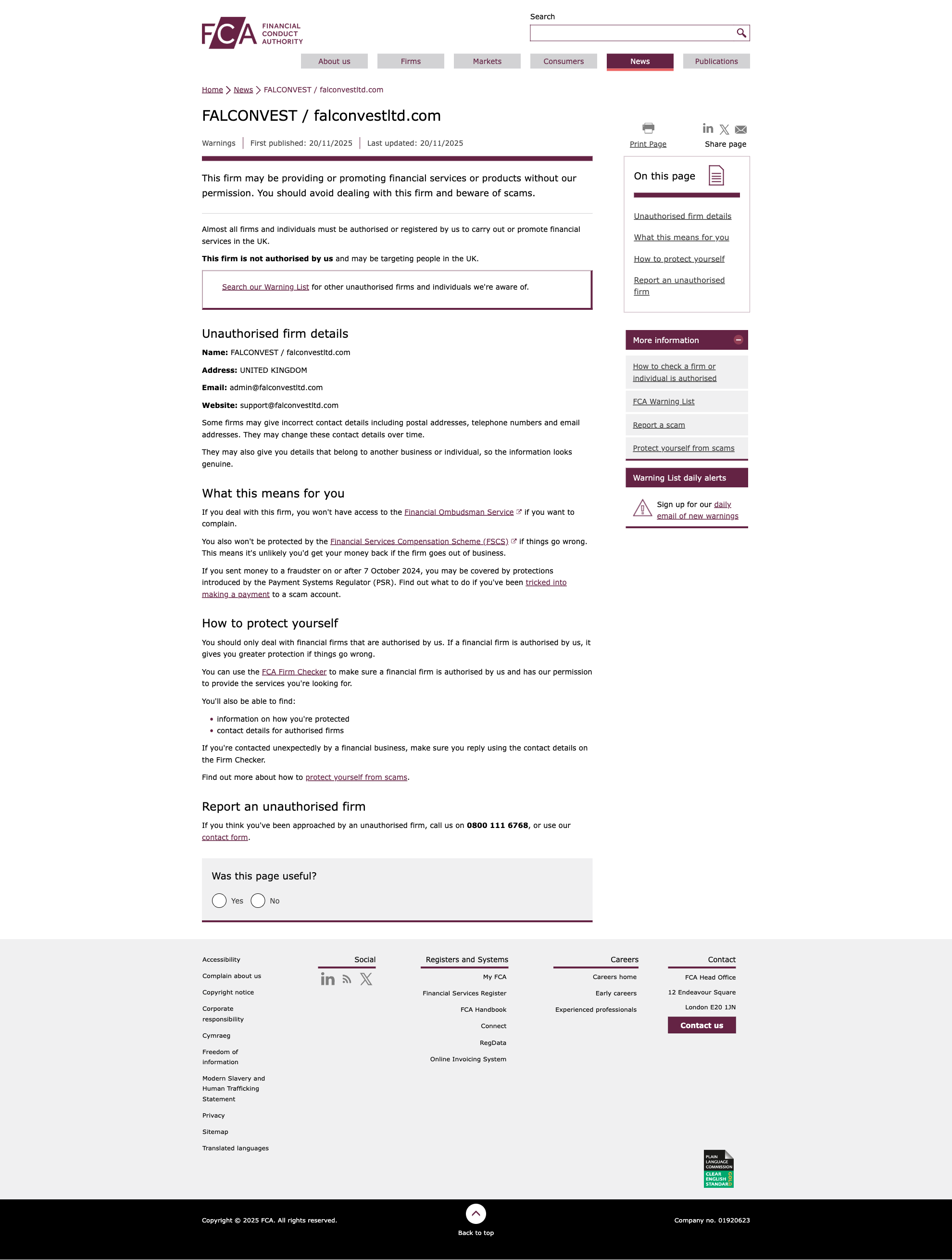UnauthorizedFCA 2025-11-20 Illegal Trading Warning Latest: FALCONVEST / falconvestltd.com Illegal Business Exposed!