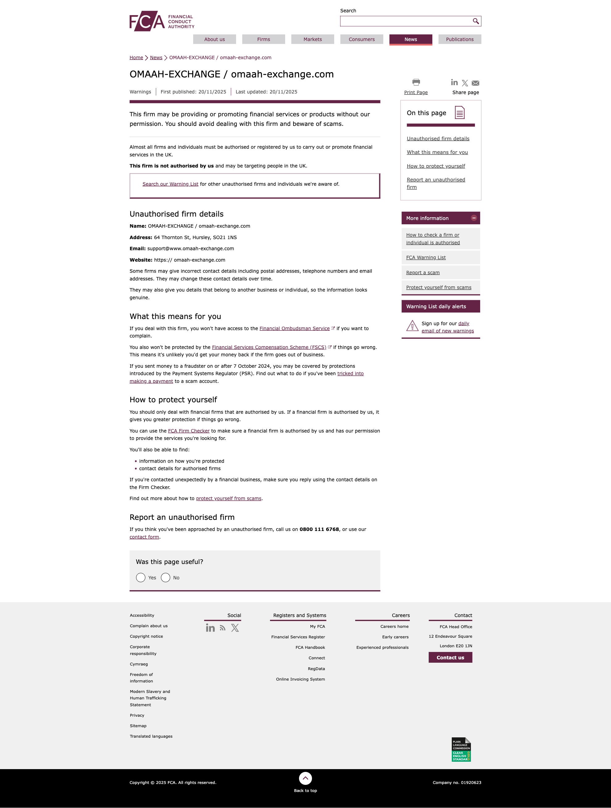 UnauthorizedFCA 2025-11-20 Illegal Trading Warning Latest: OMAAH-EXCHANGE / omaah-exchange.com Illegal Business Exposed!
