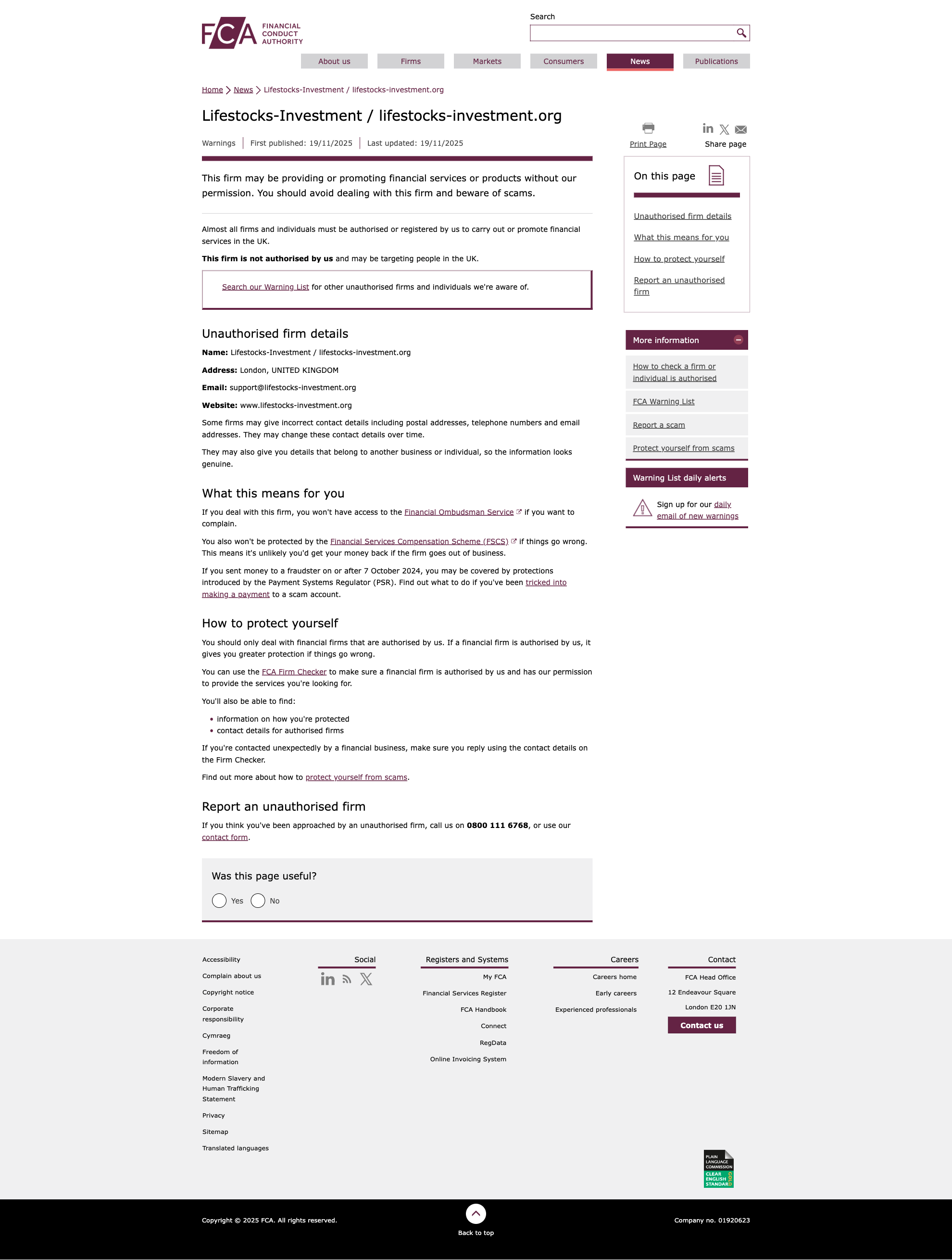 UnauthorizedFCA 2025-11-19 Illegal Trading Warning Latest: Lifestocks-Investment / lifestocks-investment.org Illegal Business Exposed!