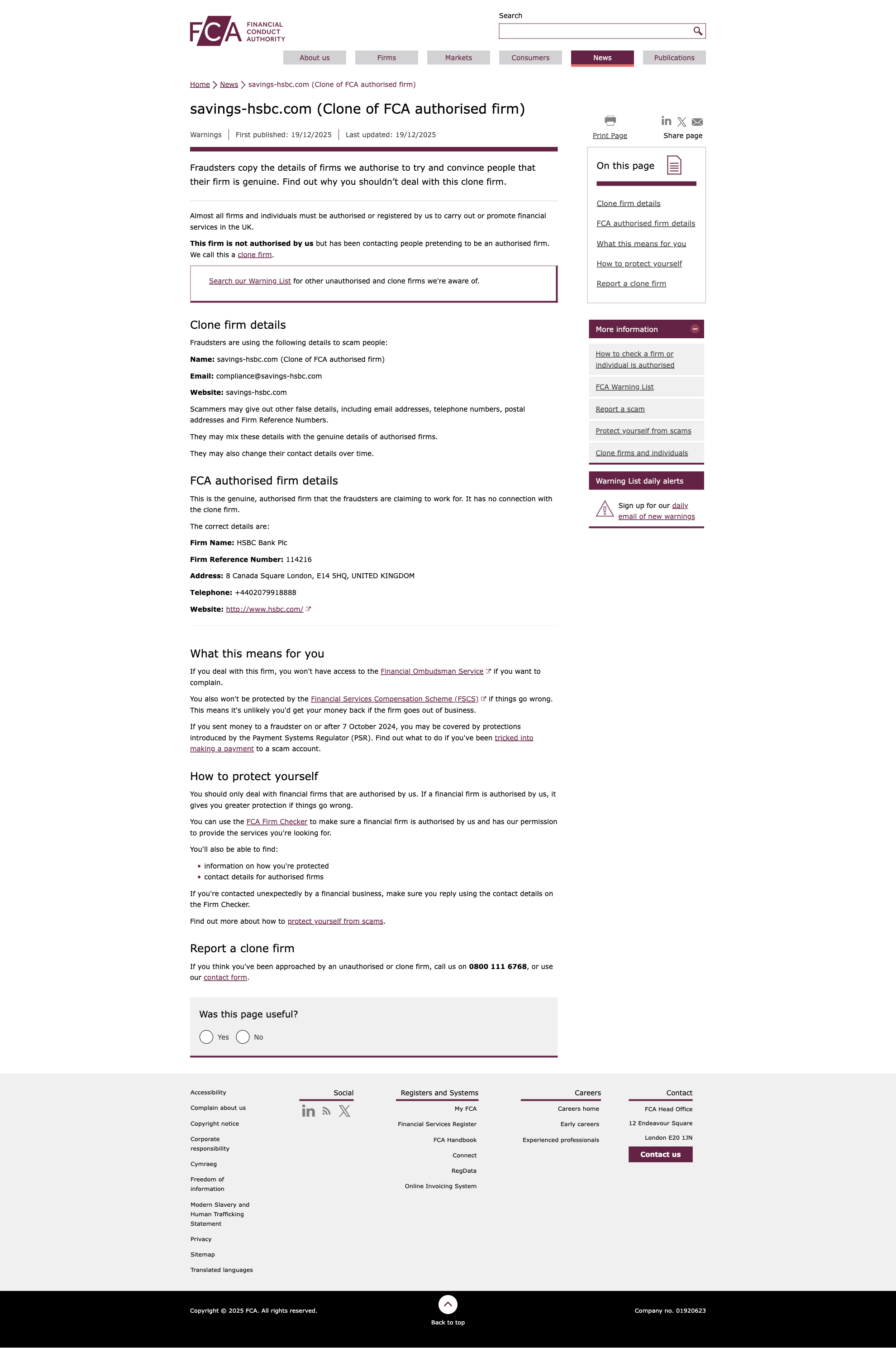 Clone traderFCA 2025-12-19 Avertissement de trading illégal Dernier : savings-hsbc.com Affaires illégales exposées!