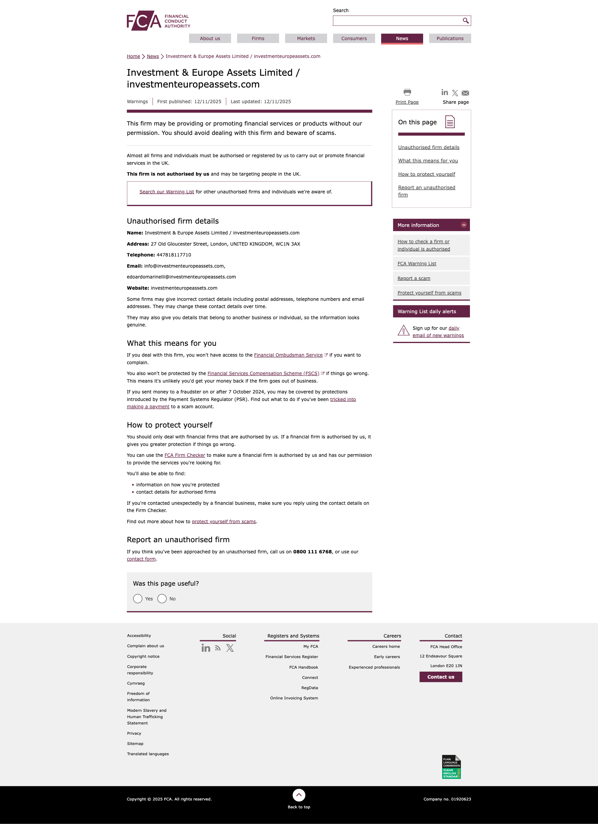 Tidak sahFCA 2025-11-12 Peringatan Perdagangan Ilegal Terbaru: Investment & Europe Assets Limited / investmenteuropeassets.com Bisnis Ilegal Terkena!