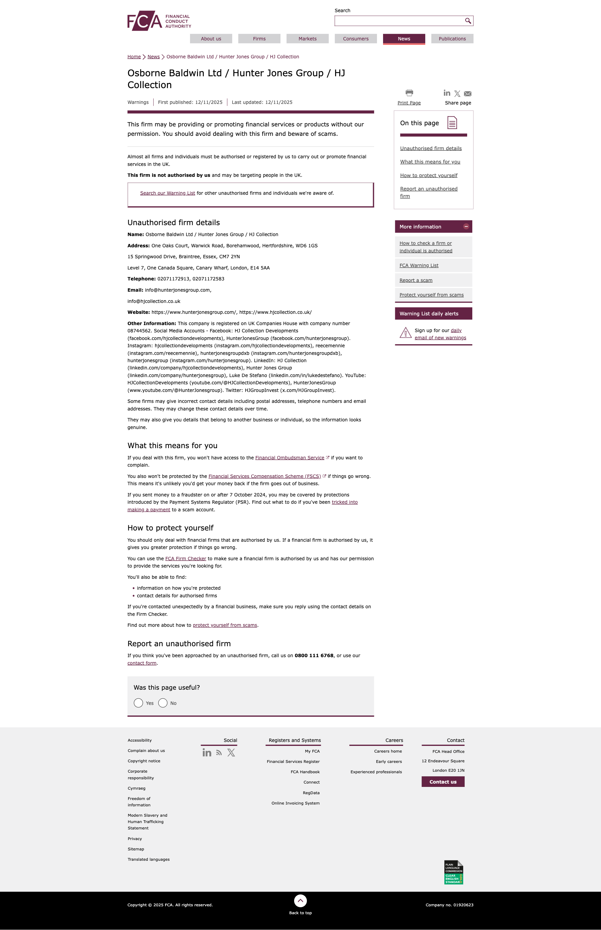 Tidak sahFCA 2025-11-12 Peringatan Perdagangan Ilegal Terbaru: Osborne Baldwin Ltd / Hunter Jones Group / HJ Collection Bisnis Ilegal Terkena!