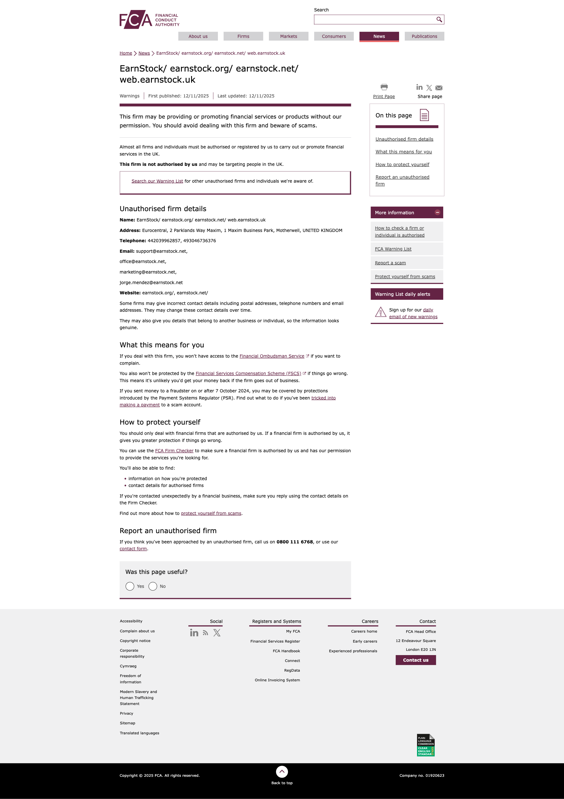 Tidak sahFCA 2025-11-12 Peringatan Perdagangan Ilegal Terbaru: EarnStock/ earnstock.org/ earnstock.net/ web.earnstock.uk Bisnis Ilegal Terkena!