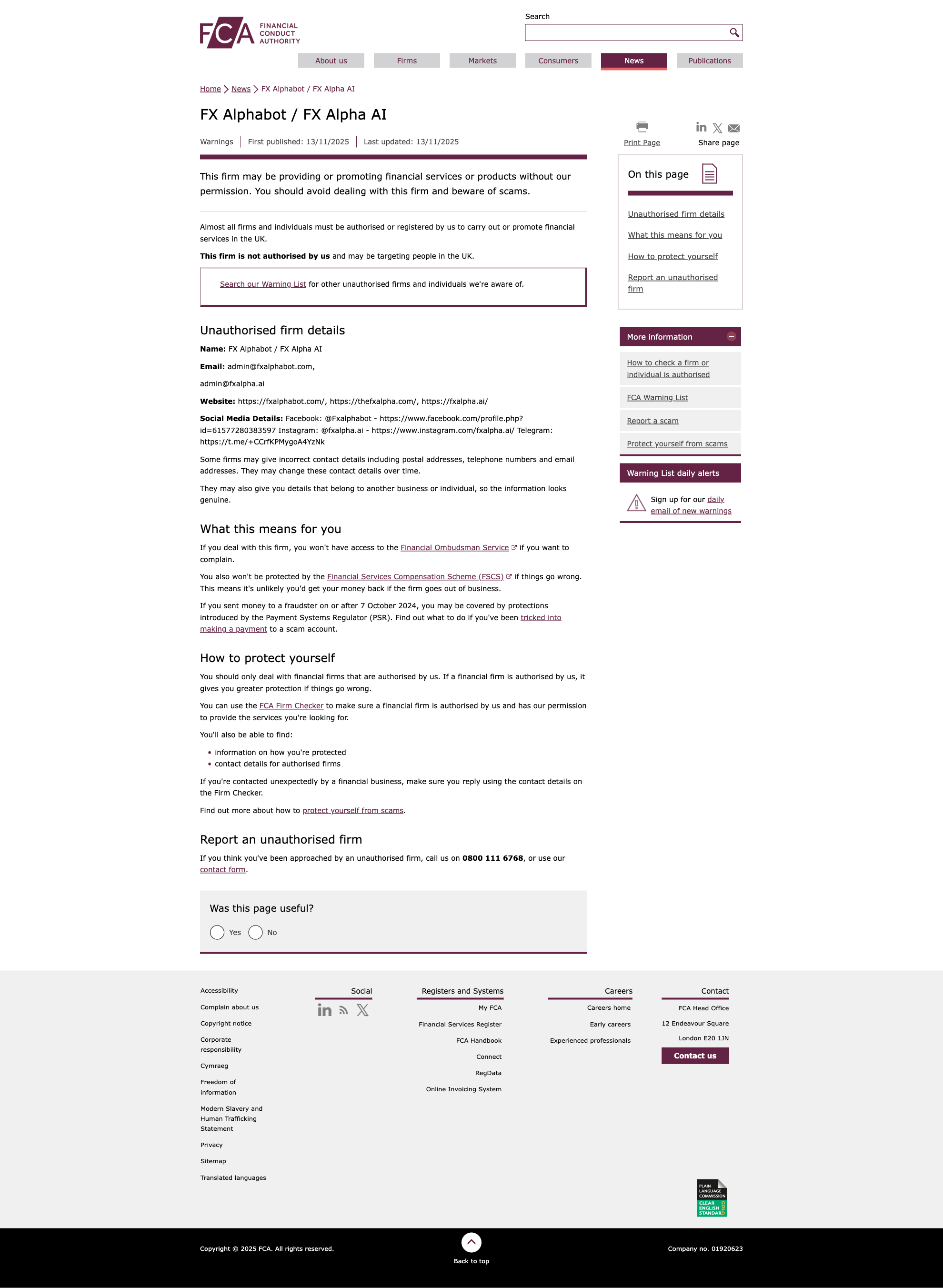 Tidak sahFCA 2025-11-13 Peringatan Perdagangan Ilegal Terbaru: FX Alphabot / FX Alpha AI Bisnis Ilegal Terkena!