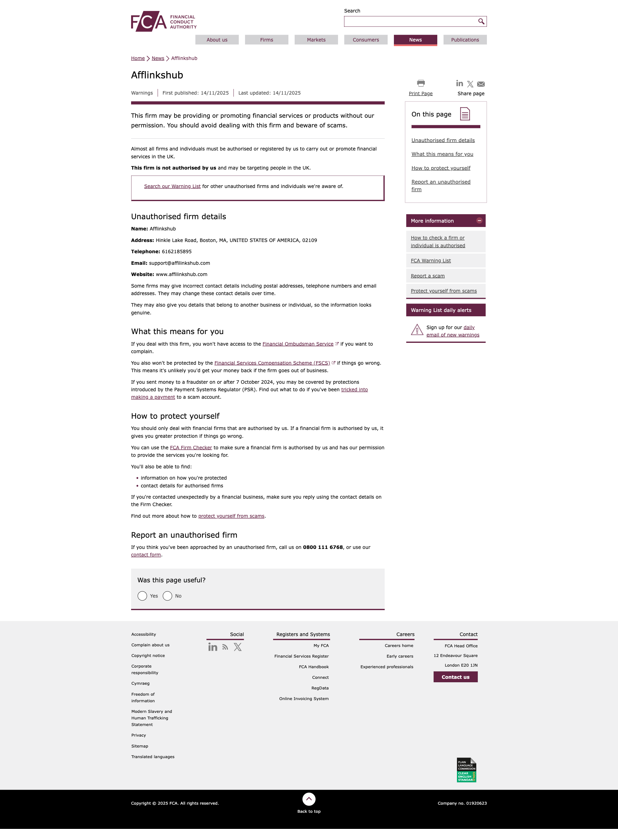 ไม่ได้รับอนุญาตFCA 2025-11-14 คำเตือนการซื้อขายที่ผิดกฎหมายล่าสุด: Afflinkshub การเปิดรับธุรกิจที่ผิดกฎหมาย!
