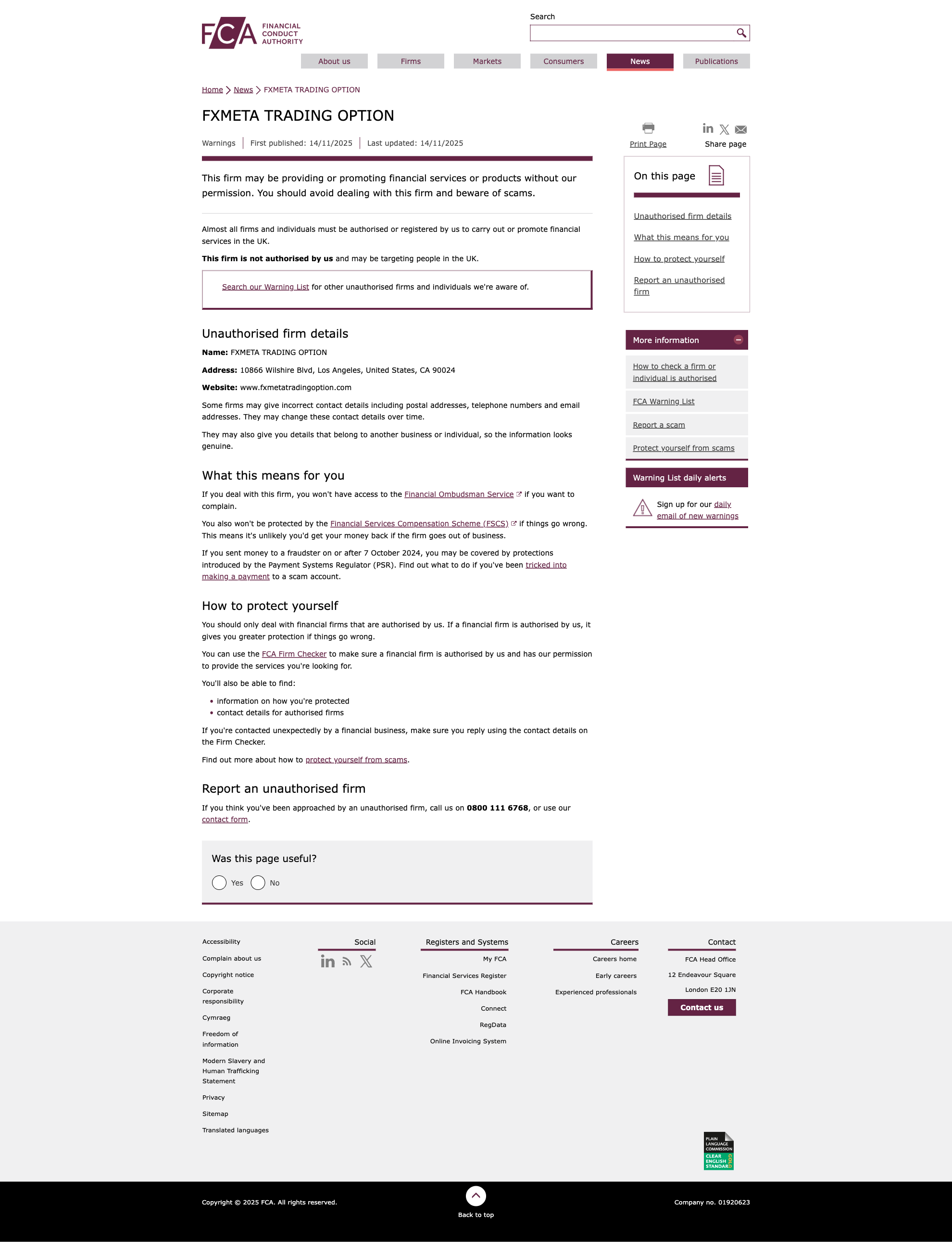 ไม่ได้รับอนุญาตFCA 2025-11-14 คำเตือนการซื้อขายที่ผิดกฎหมายล่าสุด: FXMETA TRADING OPTION การเปิดรับธุรกิจที่ผิดกฎหมาย!