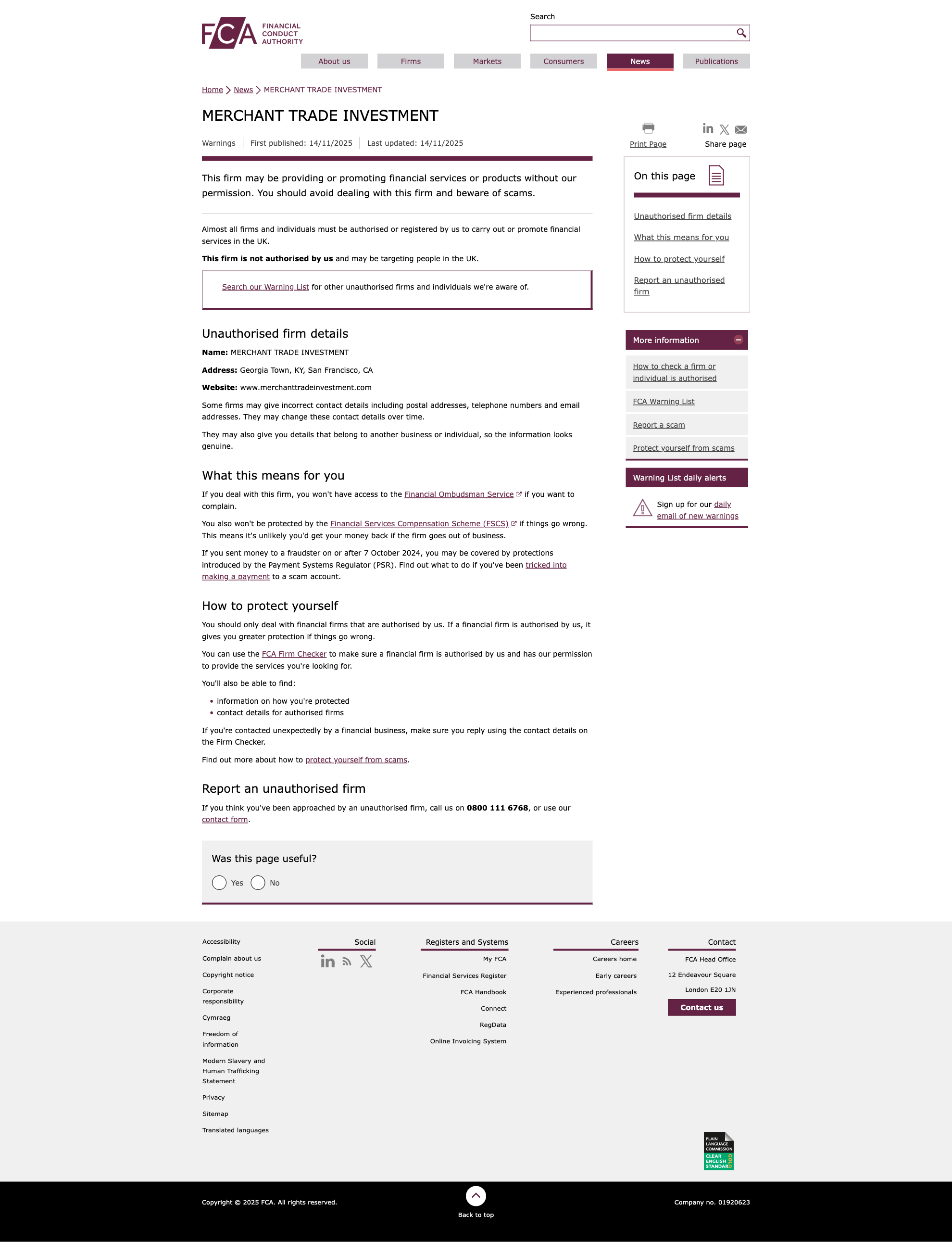 ไม่ได้รับอนุญาตFCA 2025-11-14 คำเตือนการซื้อขายที่ผิดกฎหมายล่าสุด: MERCHANT TRADE INVESTMENT การเปิดรับธุรกิจที่ผิดกฎหมาย!
