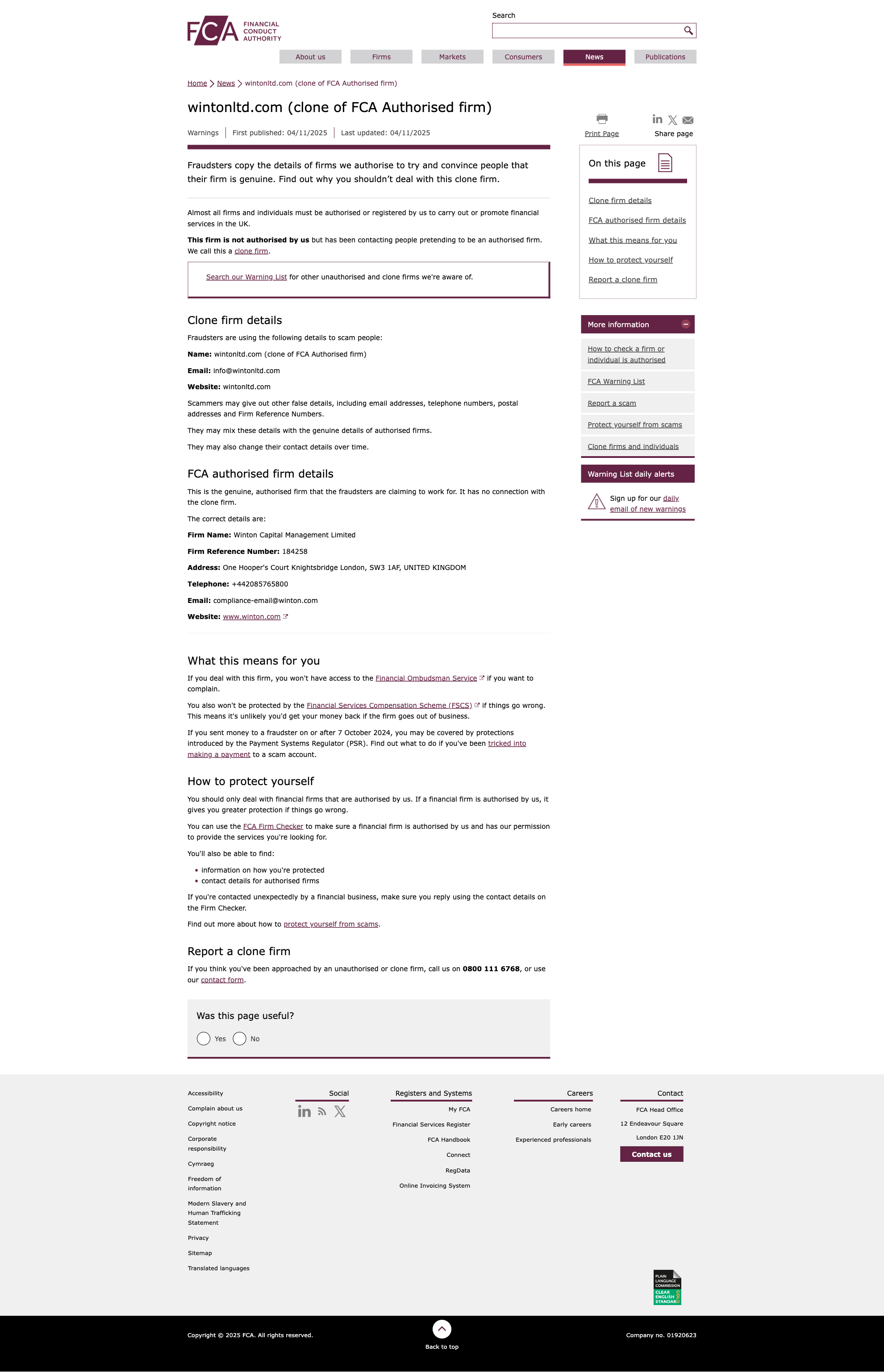 克隆交易商FCA 2025-11-04非法交易警告最新:wintonltd.com 非法營業曝光!