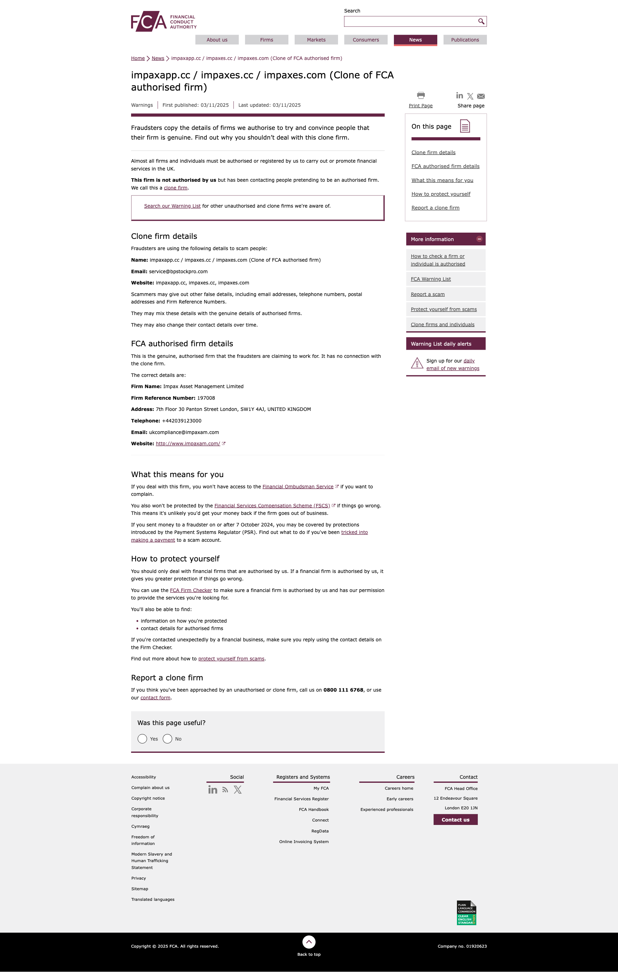 克隆交易商FCA 2025-11-03非法交易警告最新:impaxapp.cc / impaxes.cc / impaxes.com 非法營業曝光!