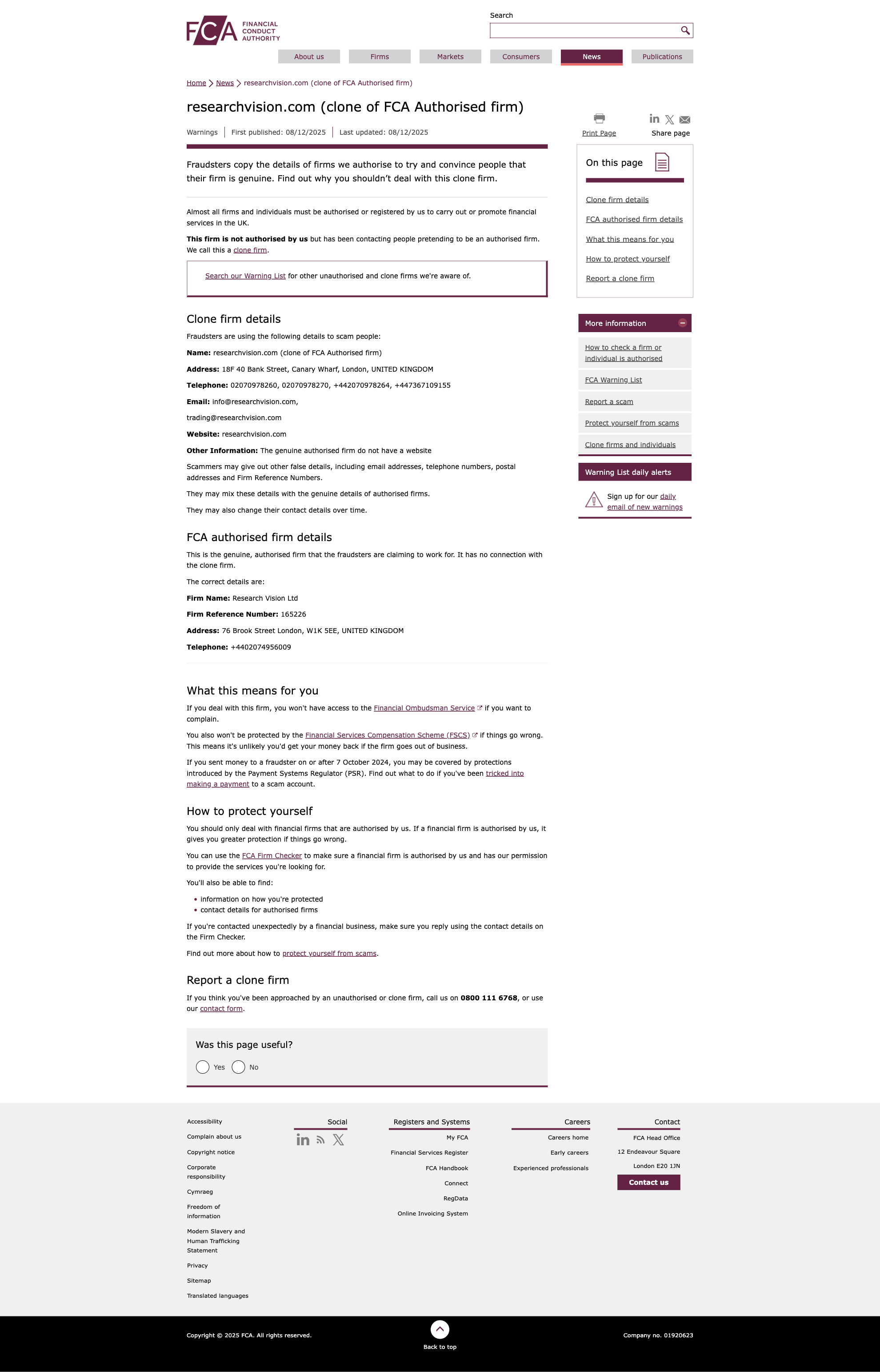克隆交易商FCA 2025-12-08非法交易警告最新:researchvision.com 非法營業曝光!