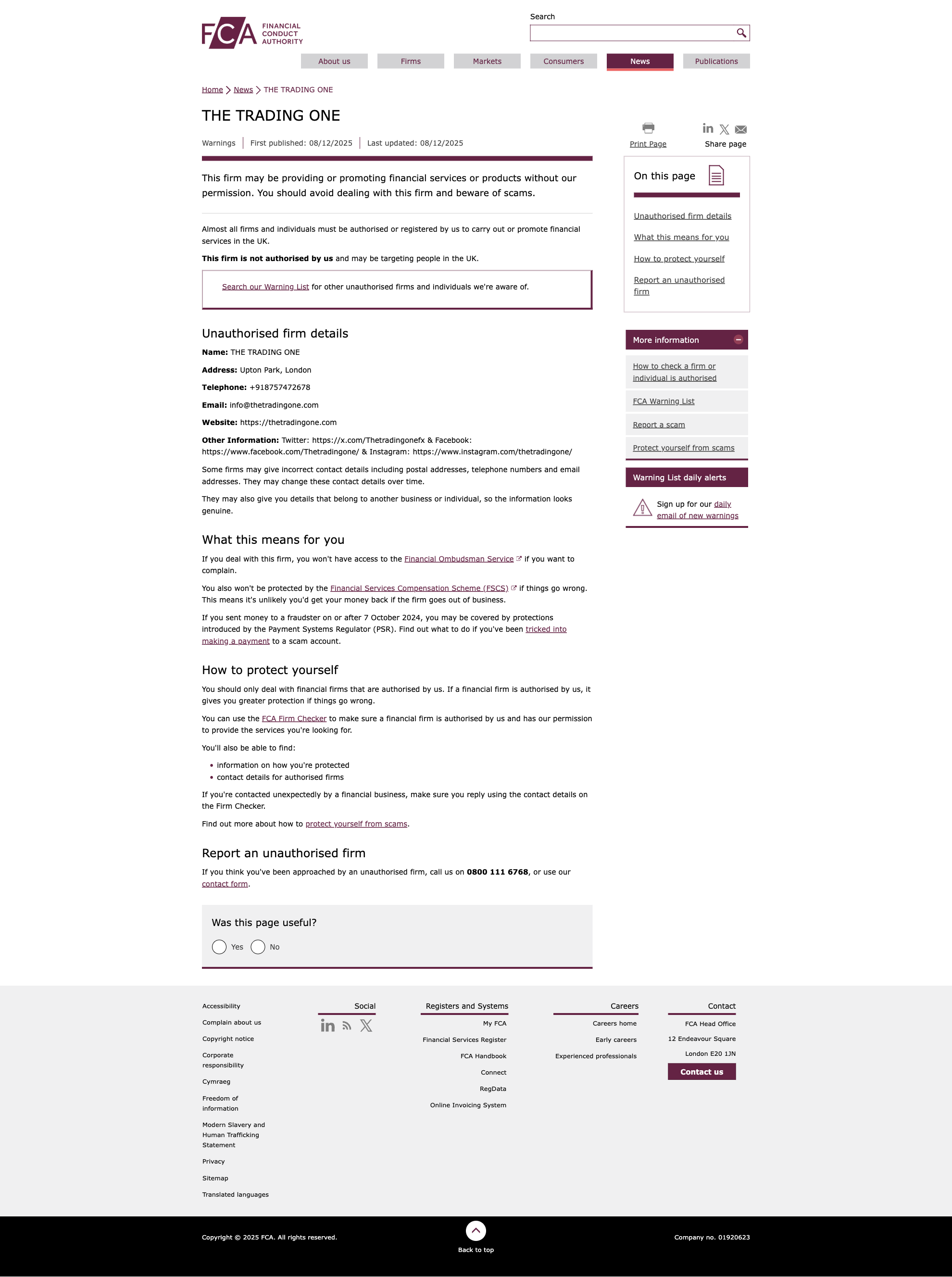 未經授權FCA 2025-12-08非法交易警告最新:THE TRADING ONE非法營業曝光!