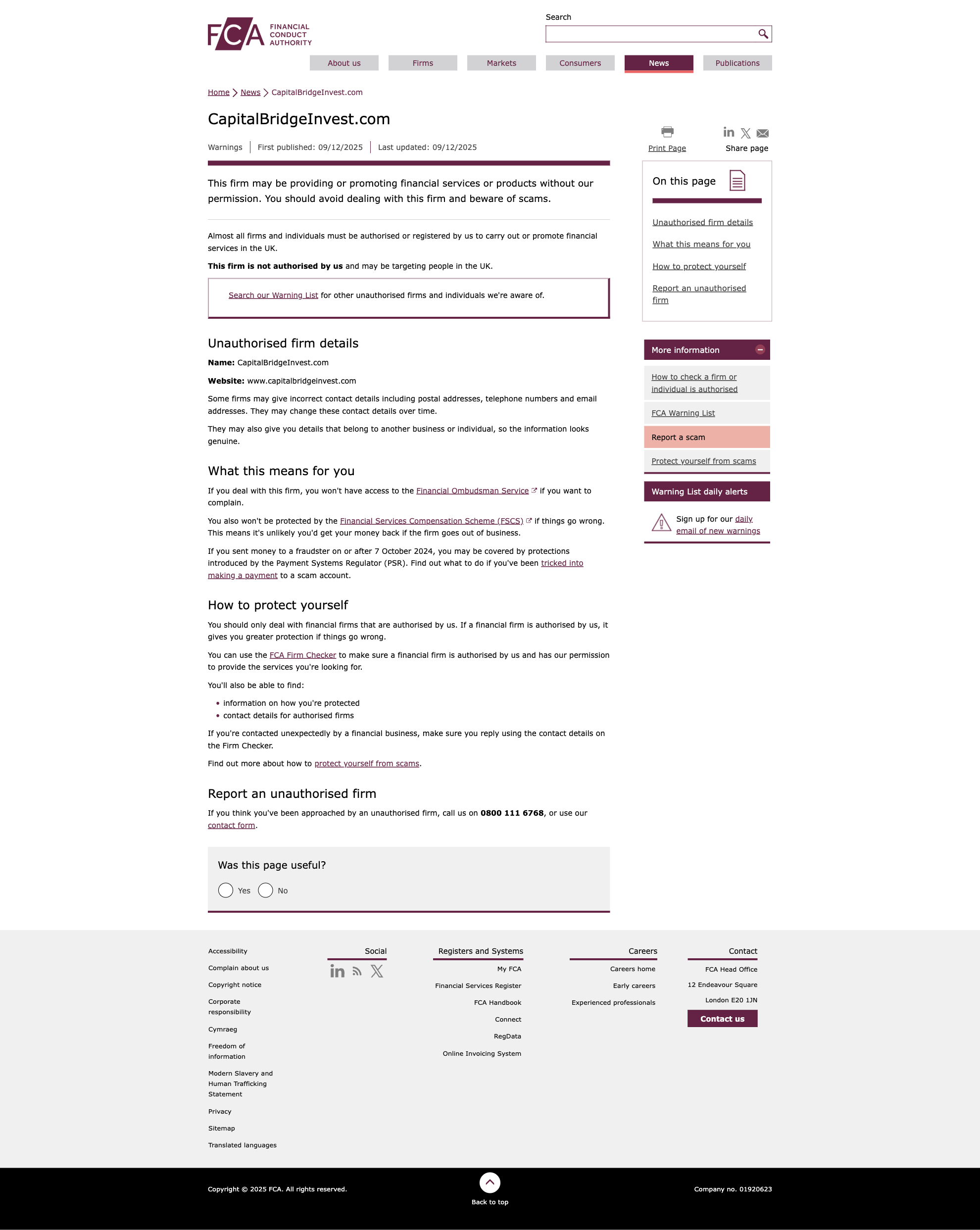 未經授權FCA 2025-12-09非法交易警告最新:CapitalBridgeInvest.com非法營業曝光!