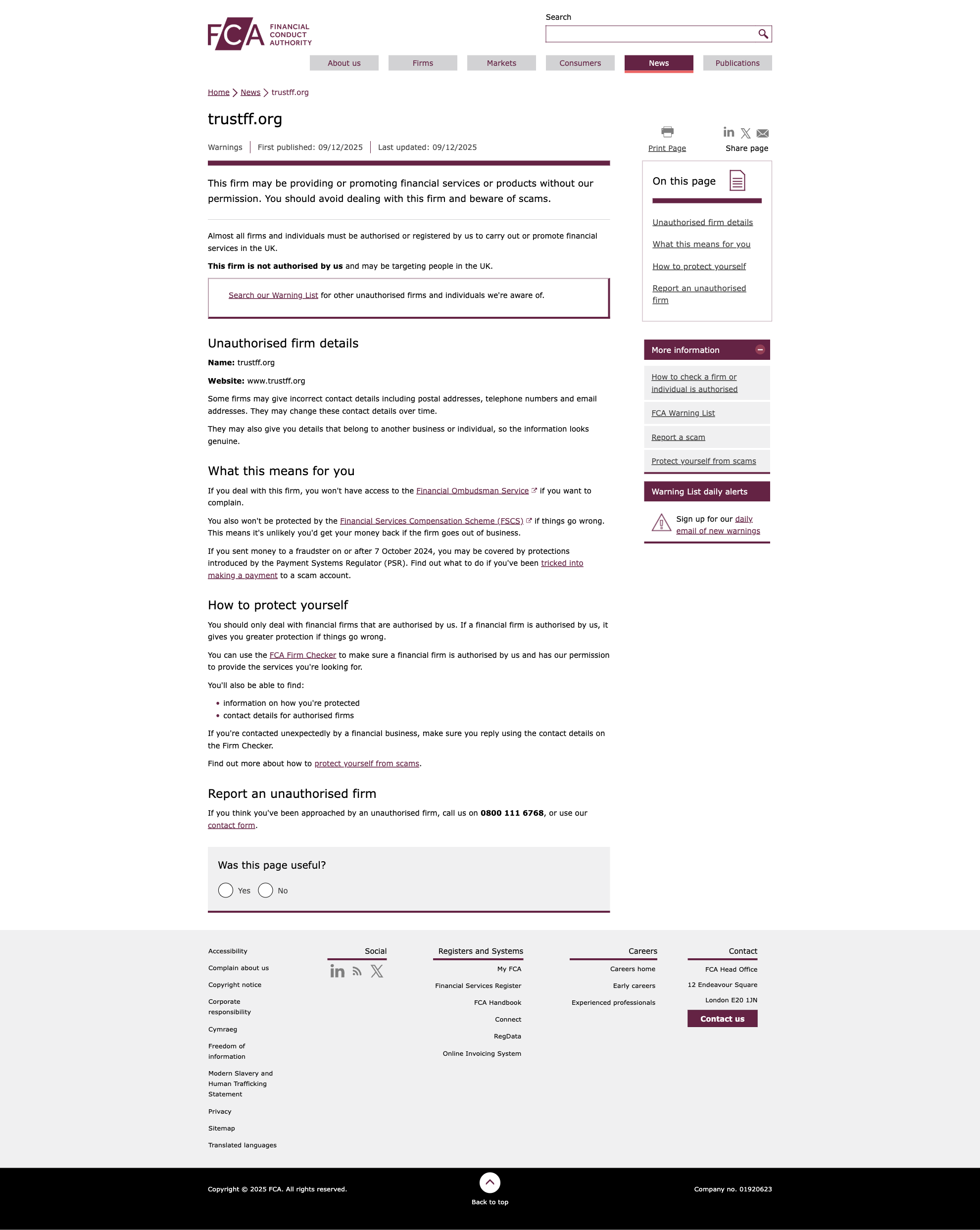 未經授權FCA 2025-12-09非法交易警告最新:trustff.org非法營業曝光!