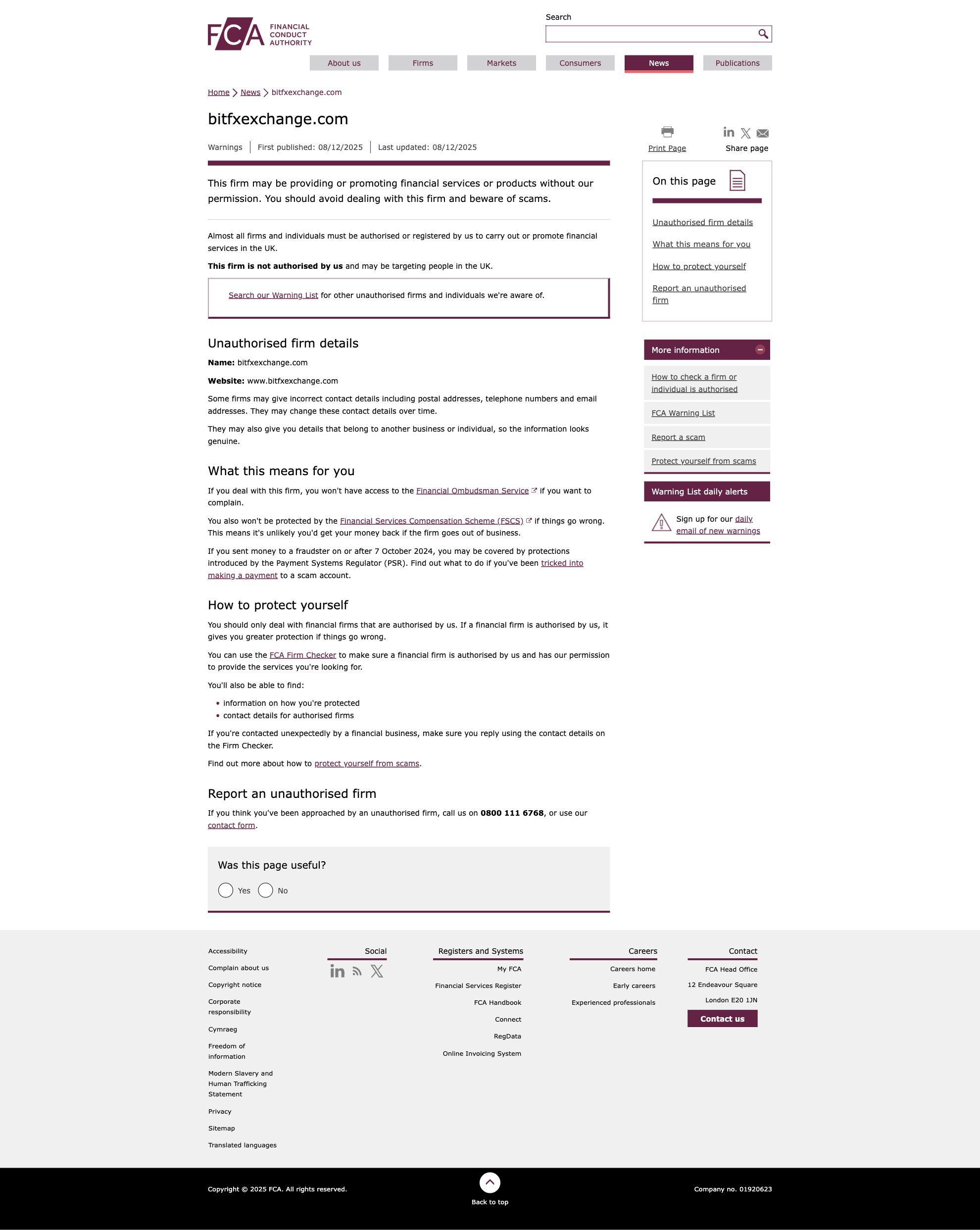 未經授權FCA 2025-12-08非法交易警告最新:bitfxexchange.com非法營業曝光!