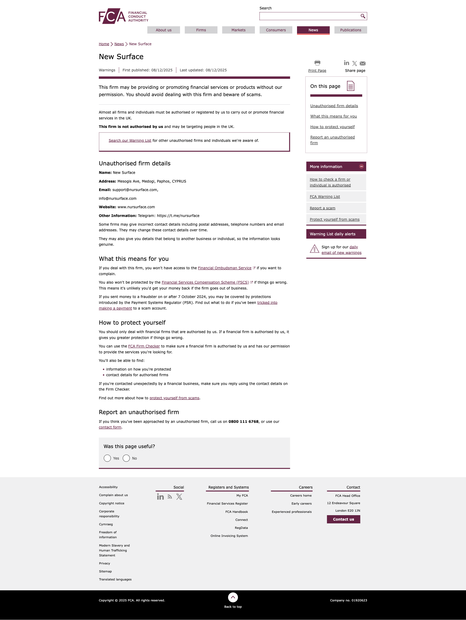 未經授權FCA 2025-12-08非法交易警告最新:New Surface非法營業曝光!